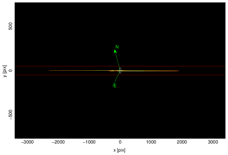 Image of the field in sky pixels, but rotated to make the long axis of the detector horizontal. Positive orders are on to the right. The green arrow points to north, and the green bar points east. The outline shows the grating part regions, blue for HEG and red for MEG. The aspect ratio is not square